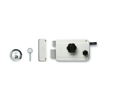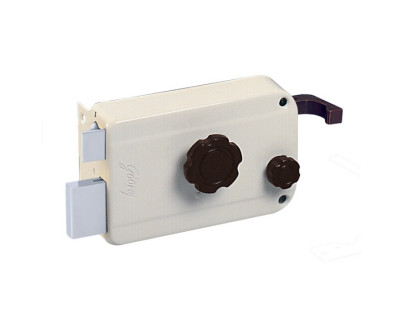 ● A tough metal rim lock for your main door that opens inside, with the dual protection of latch bolt and dead bolt.